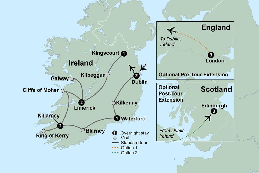 Anticipation mounts as you make your way toward the Emerald Isle and its many wonders. Rich history, rolling hills and warm smiles lie ahead in Dublin, Waterford, Killarney and Limerick. With tomorrow comes quintessential Ireland.