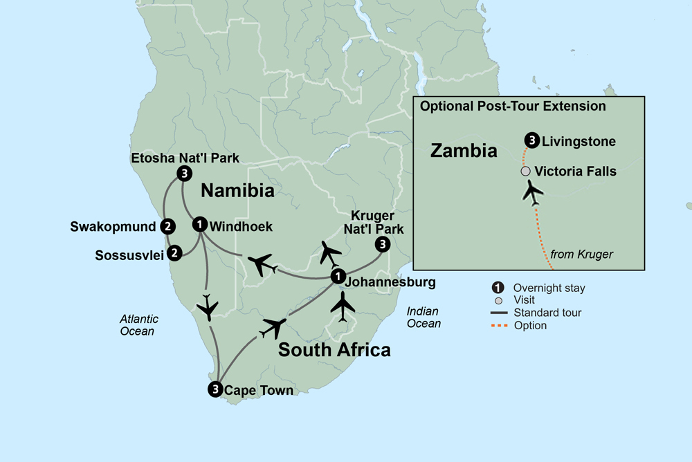 Journey into Namibia and South Africa, where unspoiled nature and wildlife coexist with enterprising cities like Cape Town and Windhoek. Search for the “Big 5” at two of Africa’s largest national parks, Etosha and Kruger, where game sightings are all but guaranteed. Travel through the remote and otherworldly Namib desert, home to some of the largest sand dunes on earth. Soak in the eclectic culture of Cape Town and share stories with a local family during a home-hosted dinner. Make friends with endangered African penguins at Boulders Beach. Experience the German-influenced resort town of Swakopmund, situated between the ocean and the desert. Drive the outskirts of the famed Skeleton Coast where shipwrecks are abundant. From desert plains to vibrant coastal cities, discover the magic of Southern Africa on this epic adventure.