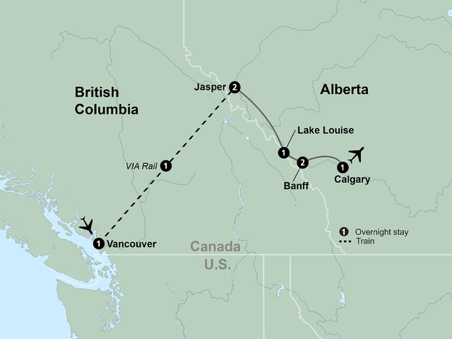 From the lush green Pacific coast of Vancouver, board VIA Rail’s The Canadian for a once-in-a-lifetime overnight train journey. Relax in the dome car and experience panoramic views of snow-capped mountains, glacial lakes, rushing rivers and the sheer unspoiled wilderness of Canada. Arrive in Jasper and see the dramatic Maligne Canyon and its picture-perfect lake. Journey along the unforgettable Icefields Parkway. Marvel at Athabasca. Discover the natural beauty of Moraine Lake and the powerful Bow Falls. Experience a day on a ranch in the Alberta plains, complete with a wagon ride in search of buffalo and a BBQ lunch in the great outdoors. End your journey in cosmopolitan Calgary. Discover the natural beauty only found in the Canadian Rockies.