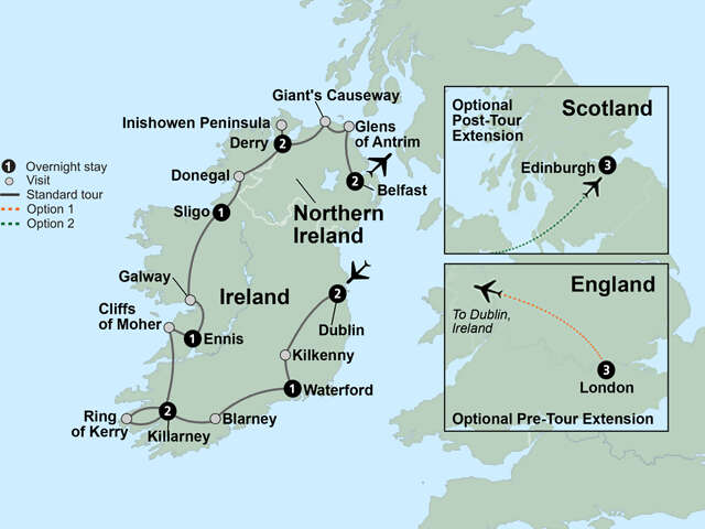 Experience Ireland in all its vibrant shades as you travel from the lively city of Dublin to the untamed natural beauty of Northern Ireland. Explore Dublin with a local guide. Take a jaunting car ride in Killarney. Experience the world-famous beauty of the Ring of Kerry. Marvel at the stunning 700-foot Cliffs of Moher. Enjoy tea and scones on a traditional family farm. Tour the walled city of Derry with a local. Stand on the awe-inspiring Giant’s Causeway. Uncover the legend of the Titanic at Belfast’s famed Titanic Experience. From breathtaking nature and stunning coasts to a captivating culture and friendly locals – this is Ireland.
