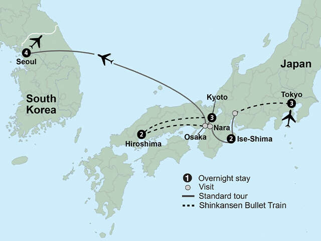 Encounter Japan’s rich cultural heritage from Tokyo to Kyoto and the energy of Seoul in South Korea. Explore Japan’s blend of past and present through Tokyo, Kyoto, and Hiroshima, traveling between them on the shinkansen bullet train. Meet Japan’s ama pearl divers, see the beauty of the Golden Pavilion, and explore Gion, the historic geisha district of Kyoto. Reflect at the Hiroshima Peace Memorial Park and Museum. In South Korea, discover Seoul’s Gyeongbok Palace, and take a tour of Korea’s infamous Demilitarized Zone. Join a conversation with a North Korean defector and enjoy a traditional lunch hosted in a Korean family’s home. The spirit of Japan and South Korea’s vibrancy shine from neon-lit streets to tranquil shrines.
