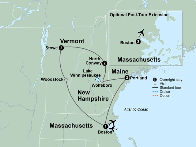 Be charmed by the colors of New England from the heart of historic Boston to the farms, mountains, and coast of the North. Begin your journey in historic Boston. Explore Woodstock, Vermont, a quintessential New England village. Watch apples transform into cider before your eyes at Cold Hollow Cider Mill. Learn about the maple sugaring industry of New England on a farm tour of the Rocks Estate. Relax as you cruise along Lake Winnipesaukee and admire the splendid views. Dig in at a traditional New England lobster dinner. Travel up the winding Auto Road to see the stunning views from the summit of Mount Washington. Marvel at Maine’s dramatic coast and discover the seaside communities of Portland and Kennebunkport. This is New England at its finest.