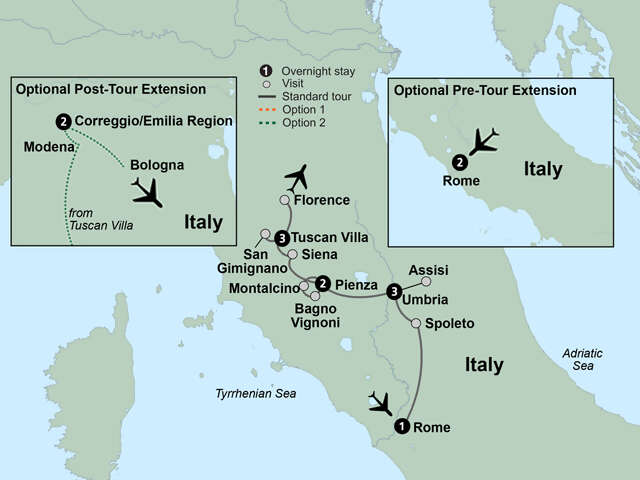 On a journey through the less-traveled country roads of Umbria and Tuscany, discover another side to the Italy you love. Stroll Assisi’s old city, and explore the Umbrian hill town of Spoleto, where the gilded façade of the cathedral rivals with the silvery sheen of the olive trees. Visit Florence, the “Cradle of the Renaissance.” In Siena, stand inside one of Tuscany’s most ancient piazzas. Admire the famous towers of San Gimignano and hunt for truffles in the Umbrian countryside. Delight in regional specialties and Italian wine with every dinner. Feel like a local as you discover the marvels of wine, cuisine, culture, and history.