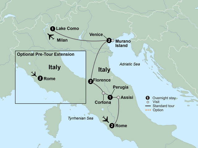 Embark on a captivating journey that takes you from the piazzas of Rome to the canals of Venice. Discover the rolling hills of the scenic Tuscan and Umbrian countryside. Explore medieval hill towns and visit Assisi, the birthplace of St. Francis. Spend time at a historic winery in the heart of the Chianti region and enjoy a chef-led cooking class with lunch. Discover the masterpieces of the Renaissance in Florence. See glass transformed into exquisite art on Murano Island. Linger in iconic Venice for two nights. Journey to the shores of glamorous Lake Como. Encounter a land rich in history, culture, art, and romance.