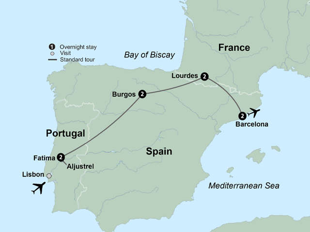 Travel to two of the world's most revered pilgrimage centers and experience the wonderful cultures and beauty of Portugal, France, and Spain. Stay two nights in Fatima and reflect on and explore the famous basilica and the tombs of Francisco and Jacinta. Travel to Aljustrel, where the shepherd children lived, and Valinhos, where Our Lady appeared after the children's return from prison. During a two-night stay in Burgos, visit its magnificent cathedral, a masterpiece of Spanish Gothic architecture and a UNESCO World Heritage Site. Enjoy a walking tour of Lourdes and a two-night stay there. Visit the Grotto where Our Lady appeared to Bernadette. End your tour in vibrant Barcelona.