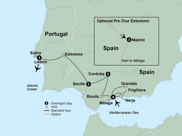 From bustling cities to peaceful stays on the Mediterranean coast, get a true taste of the Iberian Peninsula. Explore Malaga on a walking tour, where you can taste some of the delicacies of this southern Spanish region. Visit Nerja and Frigiliana, two of the Andalusian white villages that leave memories of quiet, simpler days. Visit Ronda, a clifftop marvel. Gaze at Cordoba’s Mezquita and colorful patios. In Seville, learn about the history of Flamenco with a hands-on lesson. In Lisbon, hop on a tram to explore the charming cobblestone streets, and visit Belem. Then, unwind in Portugal's vibrant capital while discovering the enchanting village of Sintra and the picturesque town of Cascais along the stunning Portuguese Riviera. Experience the history of Spain and Portugal while enjoying the region’s sunshine and local flavors.