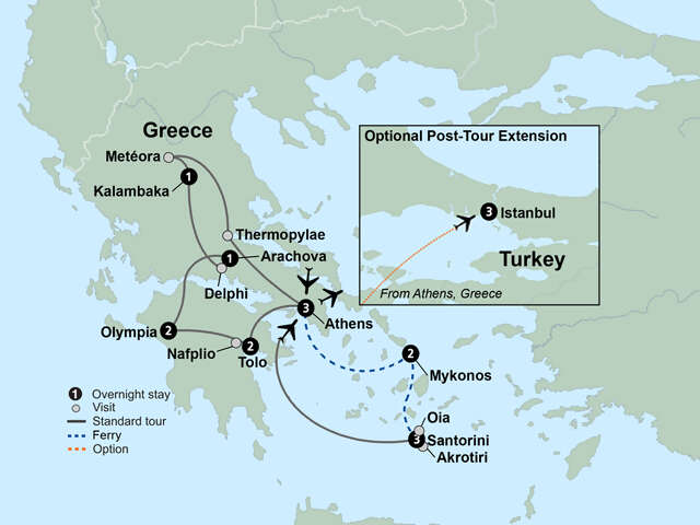 Discover the magnificent ruins of ancient Greece and bask in the brilliance of the Mediterranean. This comprehensive journey explores Greece's most important ancient monuments, including the famed Temple of Zeus, the archaeological site of Olympia and ancient artifacts of Delphi. Explore Athens on a comprehensive tour of the incredible Acropolis. Visit a local farm in the countryside to see how olive oil and wine are produced. Learn how to cook traditional Mediterranean cuisine during a cooking demonstration. Wander the winding streets, vineyards, marketplaces and beaches of Mykonos and Santorini. Explore the excavations of the ancient city at Akrotiri, the most important prehistoric settlement found anywhere in the Eastern Mediterranean. Learn the history of this fascinating country from local experts on guided tours of Athens, Metéora, Delphi, and Olympia. Throughout your journey, experience the iconic sights of Greece's Classical age with ample time to explore on your own.