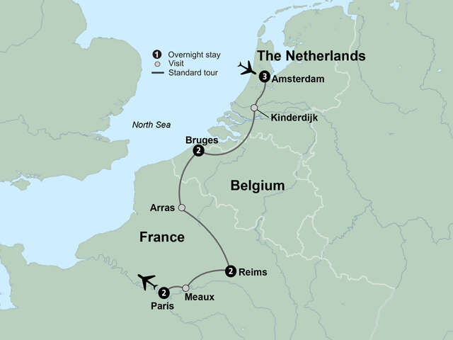 From iconic Dutch windmills and cozy Belgian streets to the world-renowned Champagne region and the “City of Light,” experience the essence of three European countries. Connect with deeply rooted cultures as you make your way through the Netherlands, Belgium, and France.