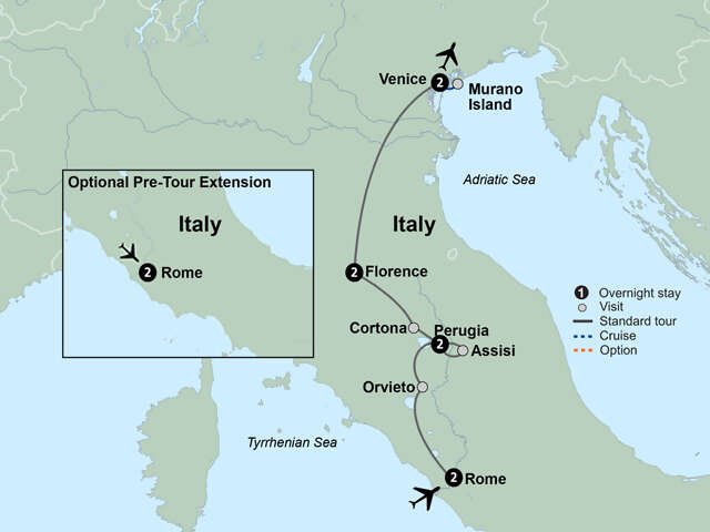 Embark on a captivating journey that takes you from the piazzas of Rome to the canals of Venice. Discover the rolling hills of the scenic Tuscan and Umbrian countryside. Explore medieval hill towns and visit Assisi, the birthplace of St. Francis. Spend time at a historic winery in the heart of the Chianti region and enjoy a chef-led cooking class with lunch. Discover the masterpieces of the Renaissance in Florence. See glass transformed into exquisite art on Murano Island. Linger in iconic Venice for two nights. Encounter a land rich in history, culture, art, and romance.
